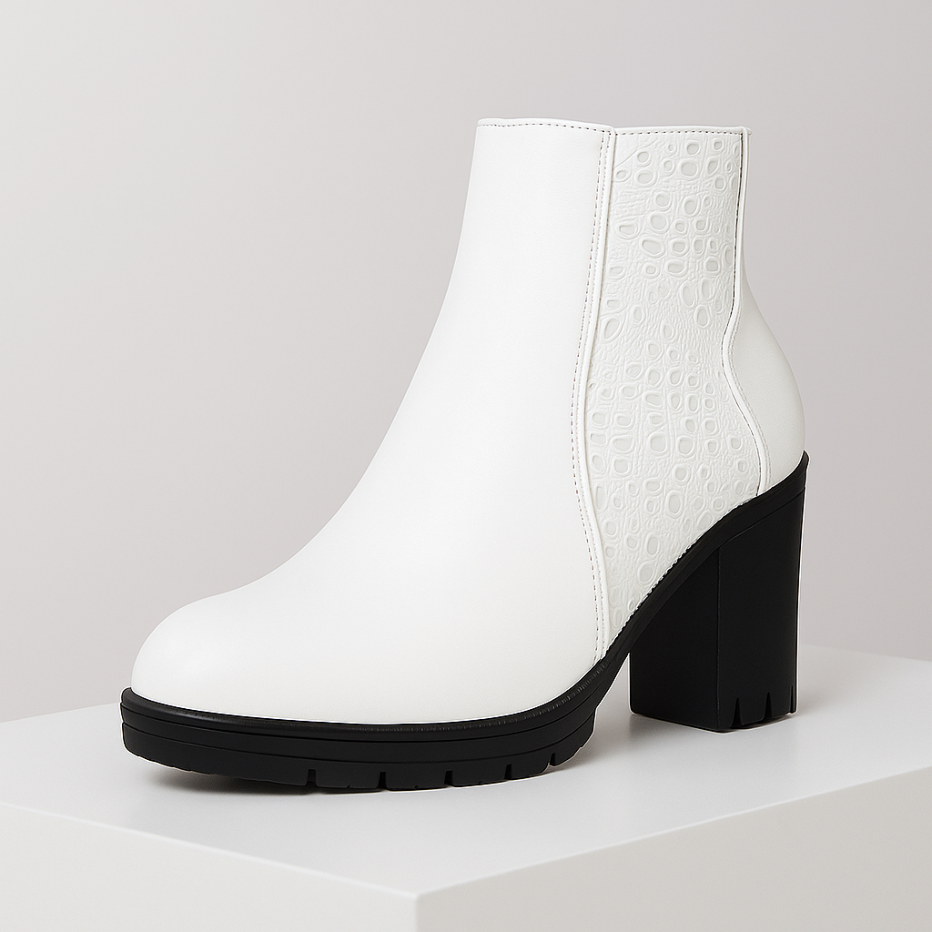Crafted in a premium leather-look finish with croc-embossed side panels, our ankle boot pairs a cushioned orthopedic insole with a stable block heel and lug outsole to soften impact and steady each step. The easy side-zip delivers quick on/off, while the polished silhouette keeps it versatile for denim, dresses, and every plan on your calendar.