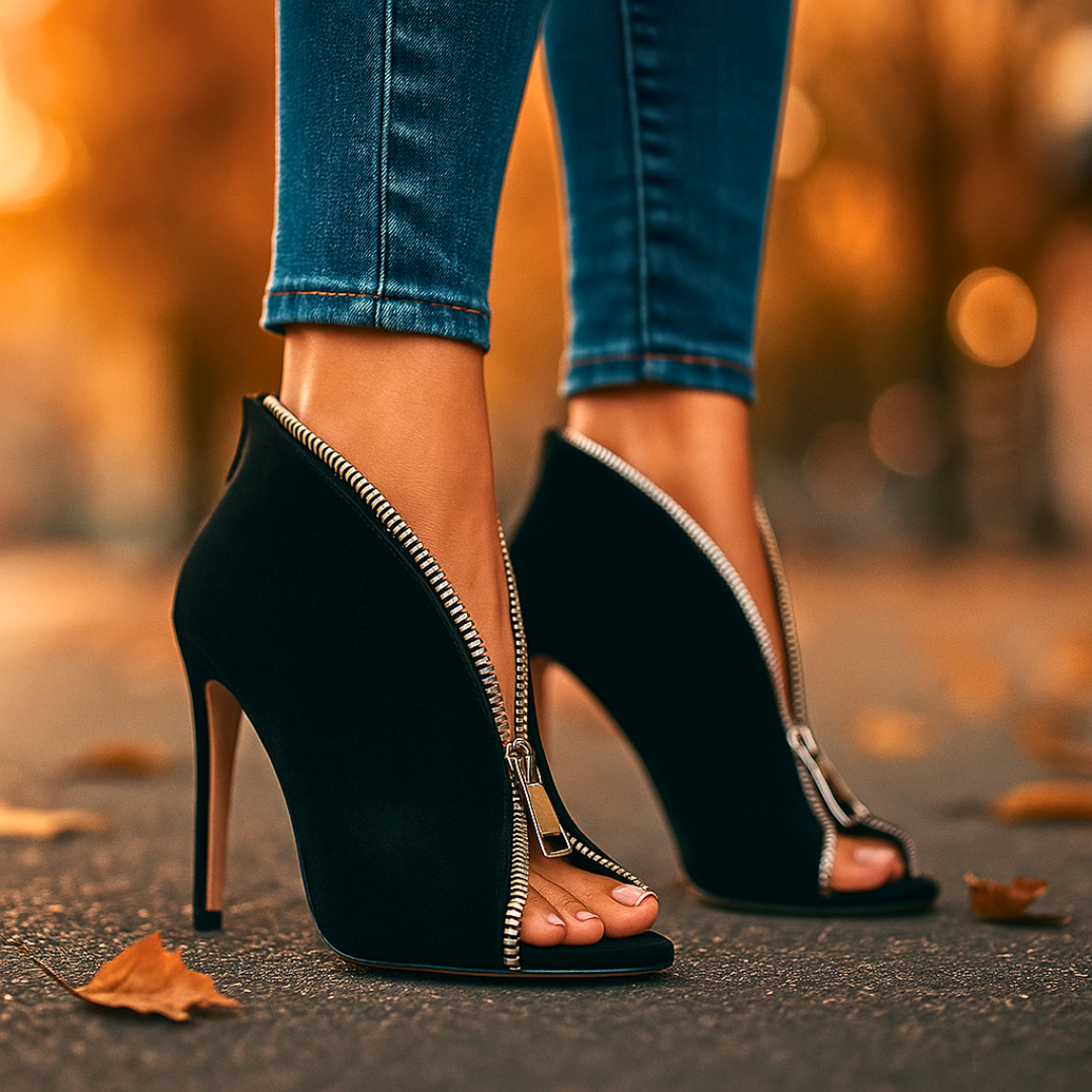 These stiletto boots zip your look into focus, with a metal-trimmed V-front that frames the foot in bold, sculpted lines. Smooth suede and leopard finishes wrap the ankle, while the peep toe and slender heel deliver dramatic height with a cushioned step that still feels wearable. Style them with denim, leather or your favourite dress whenever you want a premium, standout finish for after-dark plans.